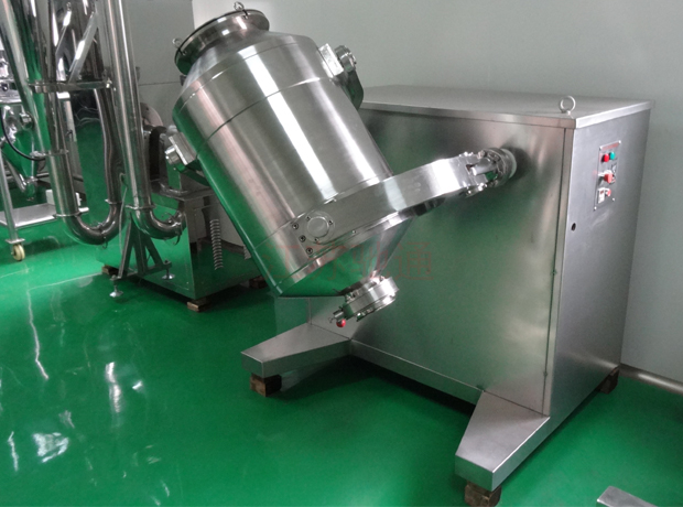 該機工作時,混科器具有三維空間運動,在進行自轉的同時進行公轉,混料器一方面具有強烈的湍動作用,加速了物料的流動和擴散,另一方 面有翻轉和平移運動,克服了離心力的影響,使物料不會產生比重偏析和集聚現象,也無死角,保證混合均勻。