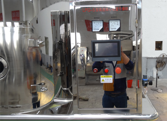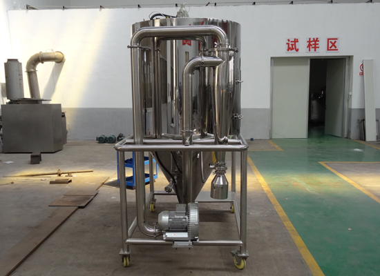 空氣經(jīng)過濾和加熱,進入干燥器頂部空氣分配器,熱空氣呈螺旋狀均勻地進入干燥室。料液經(jīng)塔體頂部的高速離心霧化器,(旋轉(zhuǎn))噴霧成極細微的霧狀液珠,與熱空氣并流接觸在極短的時間內(nèi)可干燥為成品。成品連續(xù)地由干燥塔底部和旋風分離器中輸出,廢氣由風機排空。